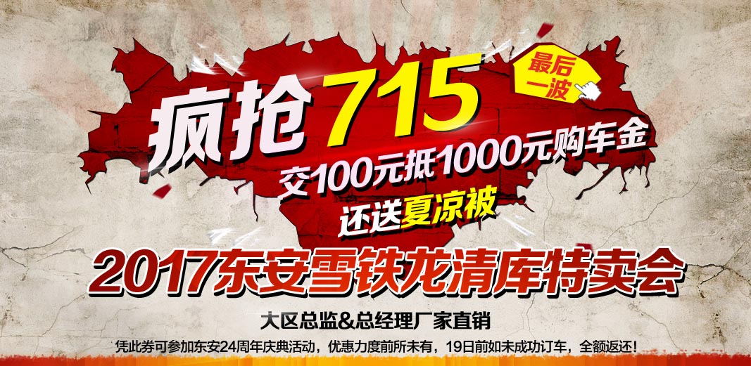 2017東安雪鐵龍年中冰點(diǎn)大促,大區(qū)總監(jiān)&總經(jīng)理廠家直銷,瘋搶715,交100元意向金抵1000元購(gòu)車金,另外還送夏涼被,優(yōu)惠力度大,快來(lái)咨詢:3533111