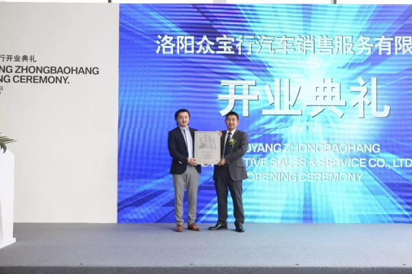 寶馬(中國)汽車貿易有限公司西區(qū)銷售經理 楊筱剛先生(左)向洛陽眾寶行汽車銷售服務有限公司總經理 白冰先生(右)正式授權
