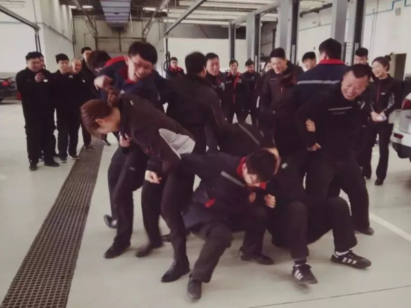 3月16日上午8點30分,在東新奧迪的售后車間便舉辦了這樣一場形式新穎地互動型晨會。當(dāng)同事們得知今天的晨會還有做游戲,一個個臉上都露出了期待的表情。隨著服務(wù)總監(jiān)一聲令下,所有人迅速分成了四組,每組首先選取四個人背靠背坐在地上,四人相互挽著胳膊,當(dāng)聽到起立口令的時候,用腿以及后背的力量站起來,以后每組依次增加2人。當(dāng)每組達到10個人的時候,想要全部站起來非常不容易。